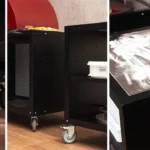 Peel holder and door holder with integrated tray for practical management of cooking utensils.