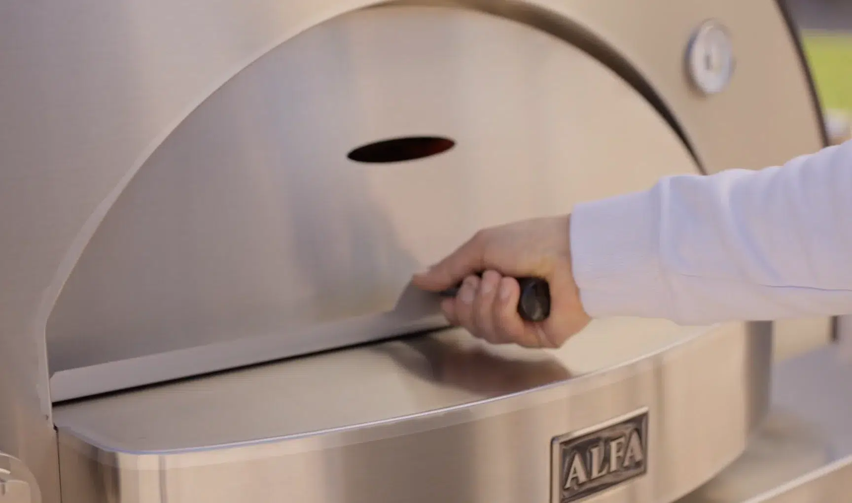 3 – After the wood is on fire, replace the oven door on the oven warming shelf leaving a small gap of 1-2 inches so air can enter the oven and to help keep the fire roaring. This helps keep the fire in the oven and heat the oven to your desired temperature faster.