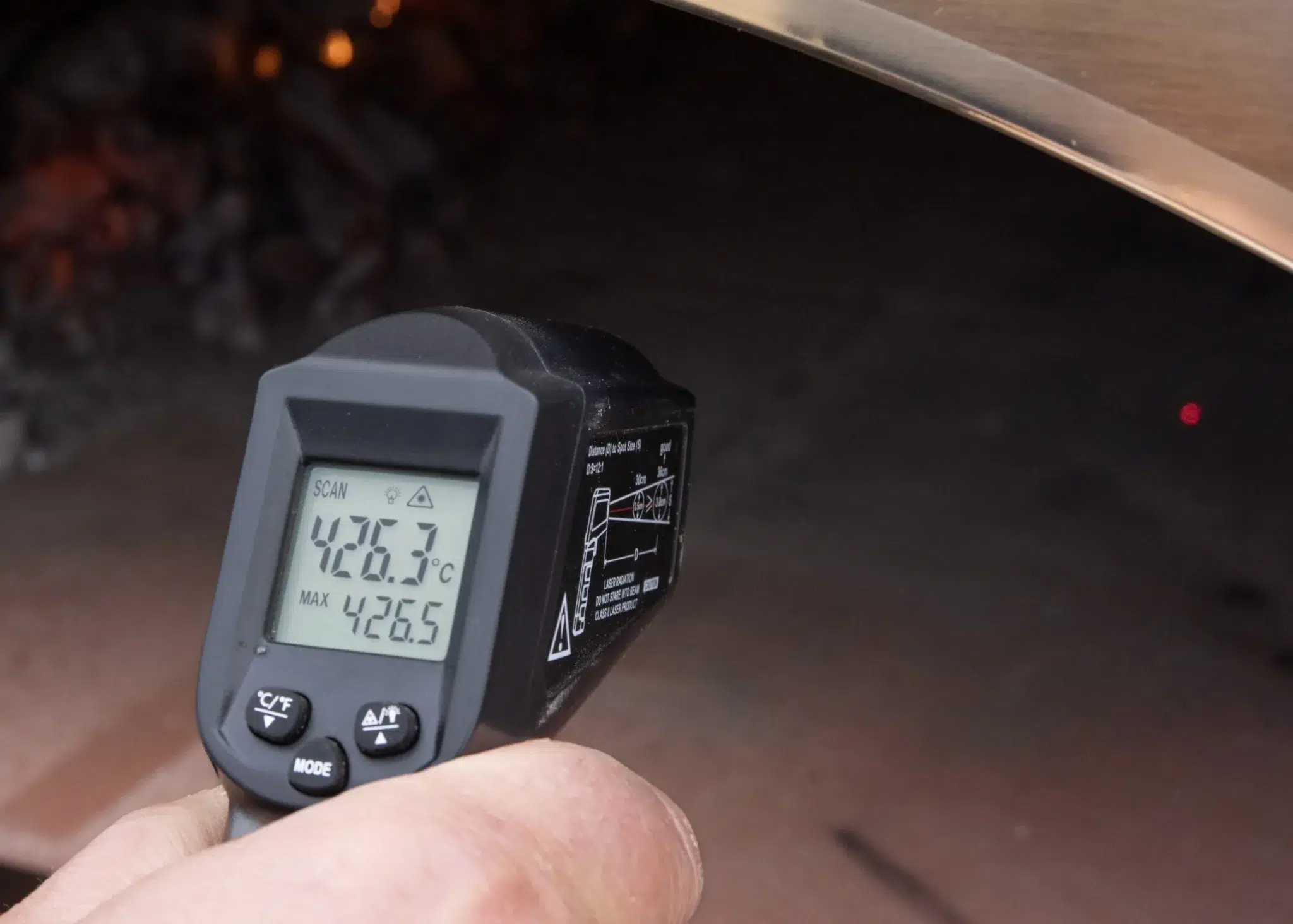 7 – Using a laser thermometer check the temperature of the oven floor. You want it to be about 370°- 430°C (700°- 800°F).