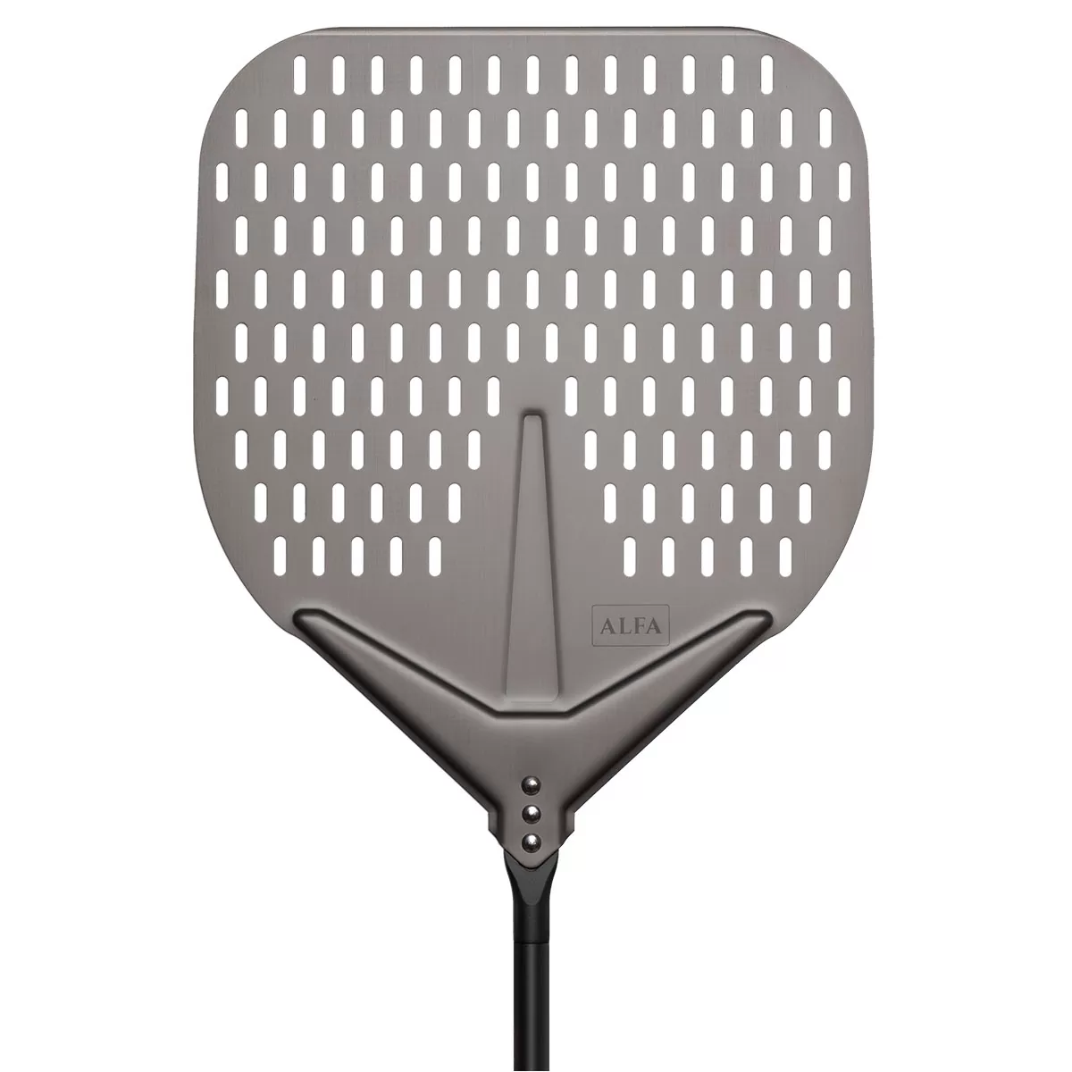 The pizza peel is perforated to get rid of the extra flour, just like professional pizza chefs do.
