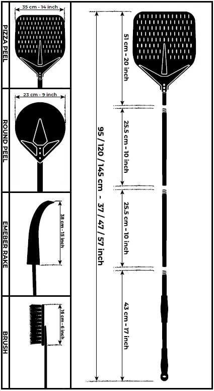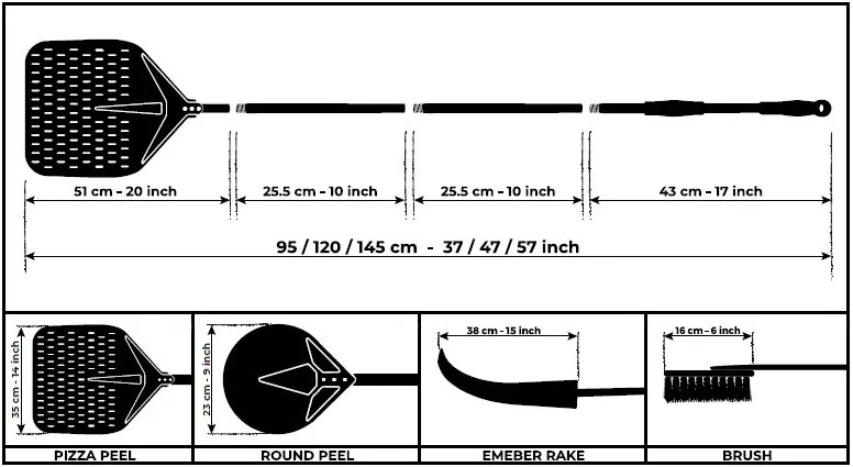 The Large Peel Set includes a regular Pizza Peel, a Small Peel, an Ember Mover and a steel brush. The handles are extendible and can be adjusted to obtain different lengths, from 95cm to 145cm.