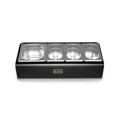 Made of 2 mm thick powder-coated carbon steel, it accommodates 4 professional steel trays, three of which are GN 1/9 in size and one is GN 1/6 in size.